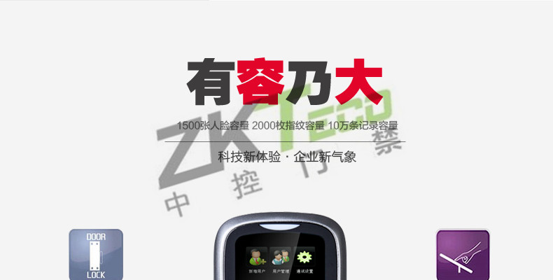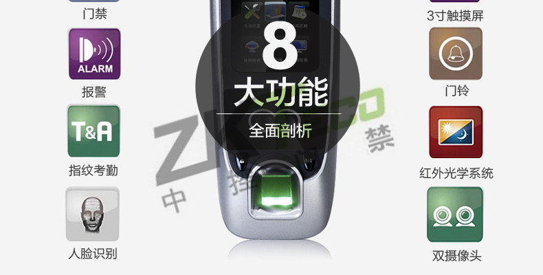 面部門禁一體機iFace7是基于ZEM800多媒體開發平臺設計的一款集指紋和面部混合驗證的3寸觸摸彩屏門禁終端,采用ZKFinger VX10.0最新指紋算法及ZKFace VX7.0面部算法,識別速度快,靈活選擇面部、指紋或者密碼開門方式,集成高分辨率夜市紅外和雙攝像頭功能,適應范圍廣。支持高級門禁功能(不同時間段開門,多人開門,拆機報警,門未關好報警,門被非法打開報警,開門按鈕輸入,有限門鈴接口,脅迫報警等)。標配的TCP/IP通訊,支持跨網段跨網關連接,是安防工程的首先產品,可用于銀行、部隊、機場等高安全場所。